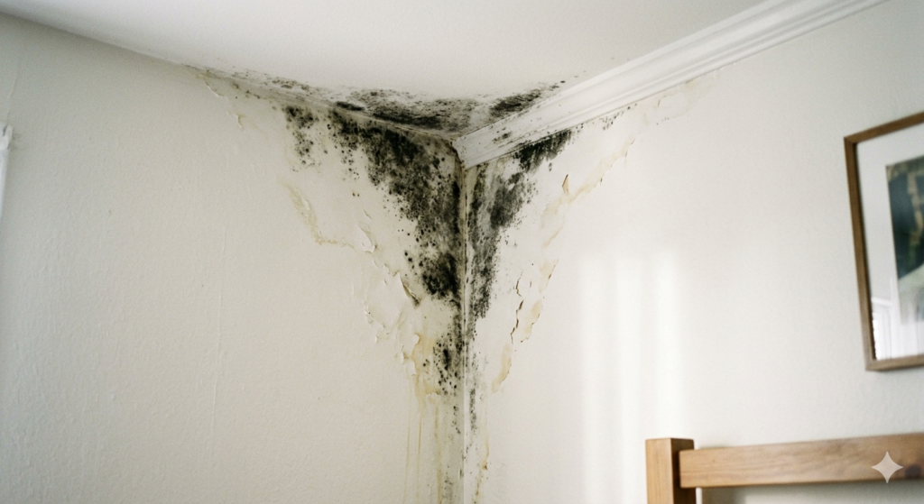 Early warning signs include persistent condensation on the inside of windows, a musty or damp smell in certain rooms, peeling wallpaper, or small patches of black mold appearing in the upper corners of exterior walls or behind large pieces of furniture.