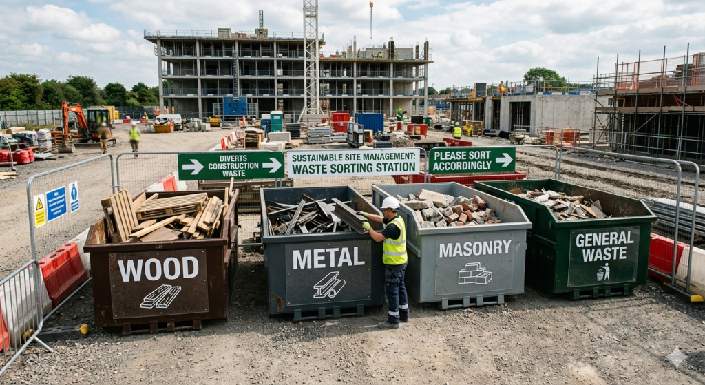 A chaotic job site is a wasteful job site. Sustainable site management requires establishing physical zones for different types of debris right from day one.